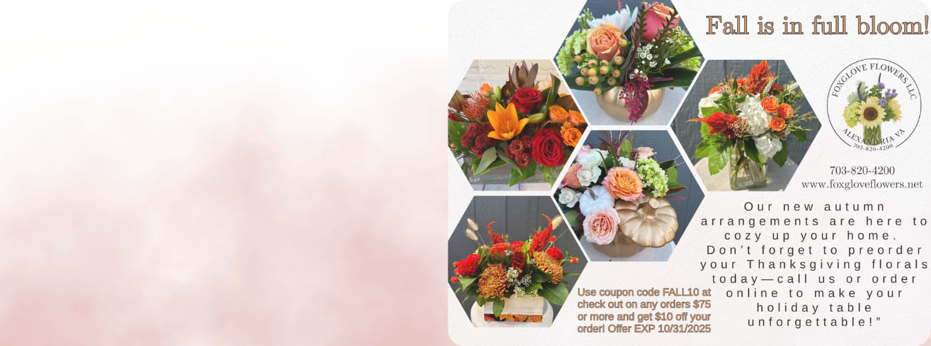 Foxglove Flowers is a Washington area favorite. With a wide range of experience, we welcome your everyday personal orders. The photos on this web site are just the tip of the iceberg!
